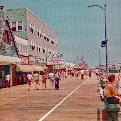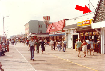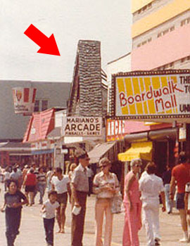 The image pictured above is one that I've created from memory - along with a bit of help from two photographs I managed to dig up at the George F. Boyer Museum in Wildwood. Both photos show a south view of the Boardwalk taken from Garfield Avenue which includes a portion of a structure I have always been fascinated by. This Boardwalk store with the mysterious facade struck me everytime I passed it - yet never knew what it was... who built it... or why it was there. It was as if there was an extra section of the Whacky Shack left over from Hunt's Pier and someone dropped it on top of this store. From its overall style of construction to its spooky paint work this rooftop strongly resembled the work of Bill Tracy's company - Amusement Display Associates (doubtful - but then again anything is possible). As I can recall this structure was there from the early to mid 70's and disappeared around 1980 or 81'. If my memory serves me correctly there were two skeletal hands emerging from the shuttered window. I do not recall a face or shape in the window although it's been many years. In any case this is how I remember it to be and would love to hear from anyone else who remembers this strange piece of Boardwalk history. Perhaps you have some information on the store and who owned it or maybe even a photograph. The photos below will give you an idea of the location. After viewing these two photographs I believe the address to be 3810 Boardwalk. I look forward to hearing from you. |