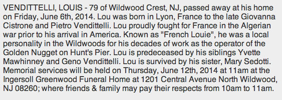 Sadly, another key member of the Hunt's Organization has left us - Louis "French Louie" Vendittelli, loving caretaker of the Golden Nugget Mine Ride, has passed away at the age of 79. Louie was an iconic figure on the Wildwood Boardwalk and like so many of Hunt's Pier's memorable attractions, he too was a one of a kind. He was an "old school" dude whose distinctive appearance and french accent made him a stand-out figure on the pier and around town. I'll miss seeing Louie and his obligatory hat, and saddened that I'll never share another conversation with him. Louie was not one to live in the past and he would always remind me that what's gone is gone, yet he would occasionally become sentimental when reminiscing about his many years on Hunt's Pier. I will always remain grateful that I had the chance to know him over the years and will always remember and appreciate his candor, his temperament, and his kindness. |