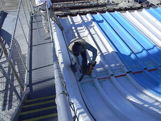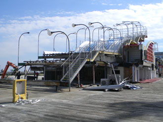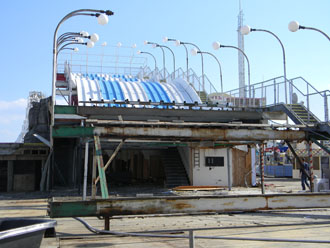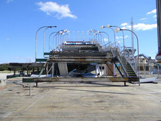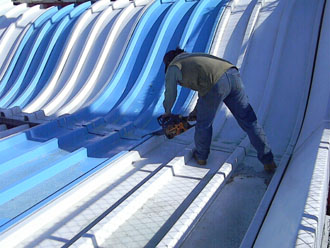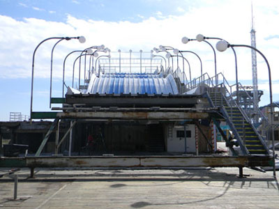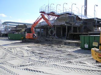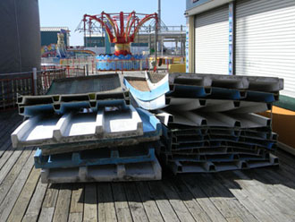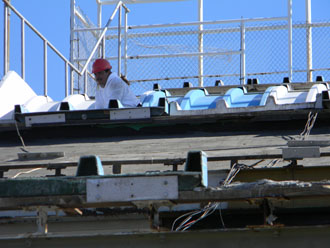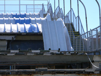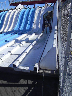 Dave of Garden State Dredging and Excavating, Inc., cuts away the fiberglass slide panels. Smaller sections of the slide are being sold for $50 with proceeds being donated to the International Association of Amusement Parks and Attractions archive preservation fund. |