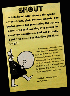_____Art Hall continued publishing SHOUT, true to its original form, for many years and demand for the guide remained strong. Eventually, however, the lighted strip once dubbed "Little Las Vegas" began to grow dim and as a result SHOUT mirrored the changes happening in The Wildwoods and, naturally, became a different kind of paper; its appearance changed as well, switching from long tabloid (11"x17") to short tab (11"x14") in 1995. In 2005, after a 43 year run, the final issue of SHOUT came off the press bringing to an end the ultimate weekly guide to summer fun. |